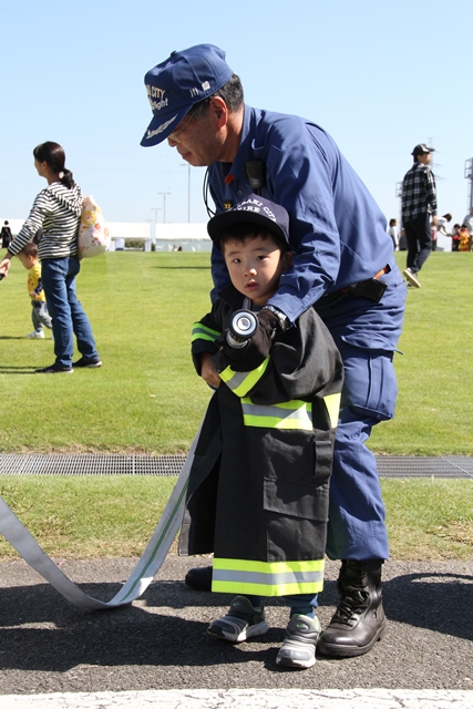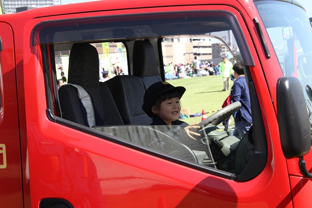 ちびっこ消防服を着て、消防車に乗ってみたり