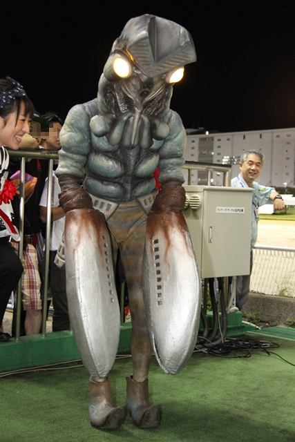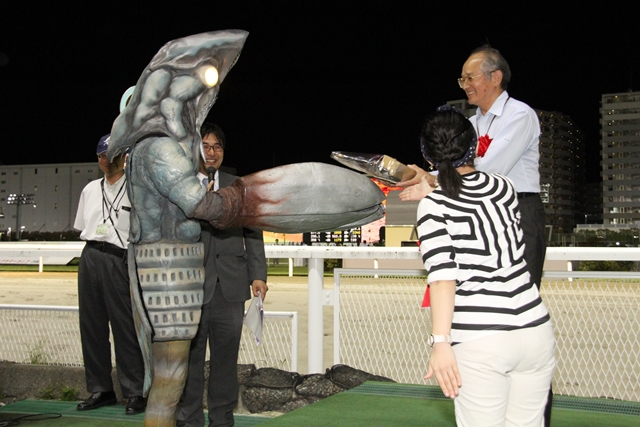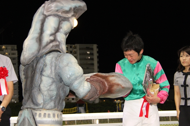 優勝騎手インタビューの間、勝利を称えるバルタン店長