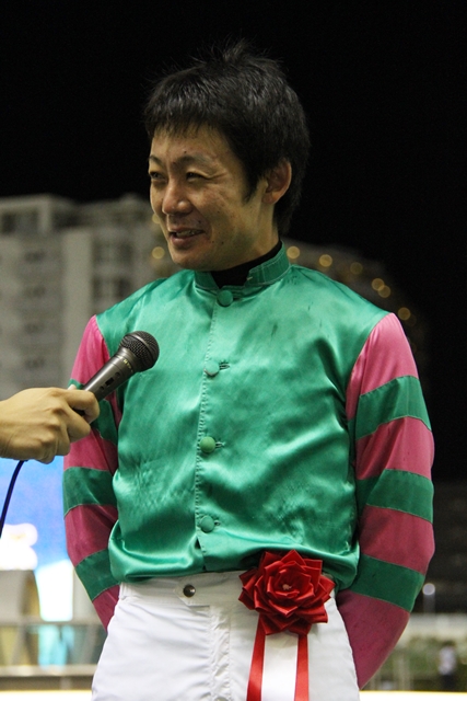 優勝ジョッキー:田中力騎手はどう握手してよいのか戸惑ったようです。