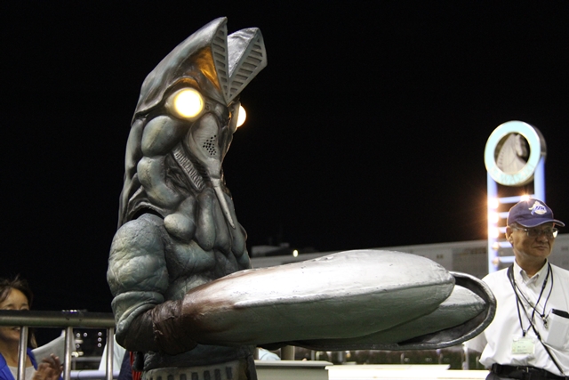 怪獣酒場グッズの詰め合わせを贈るバルタン店長